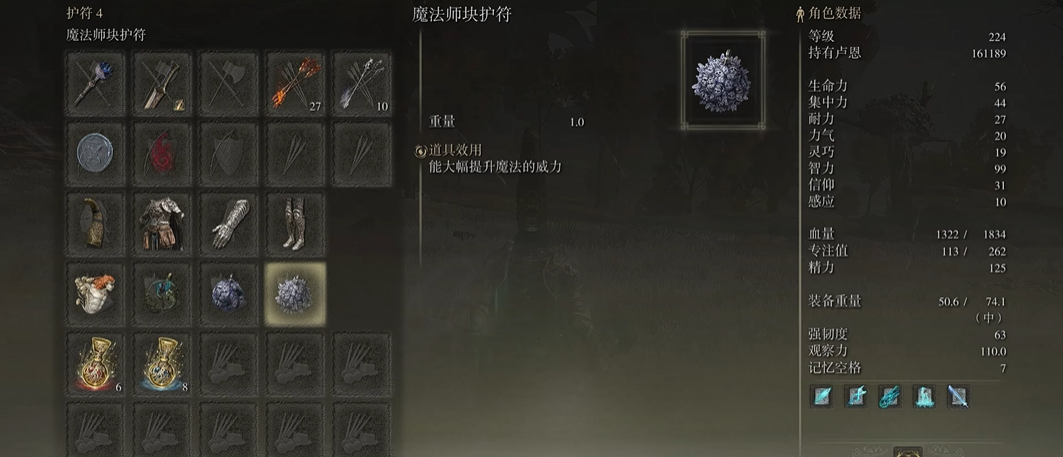 法师护符搭配的核心在于最大化法术伤害输出并兼顾生存,通常围绕几件强力增幅护符构建。核心输出护符包括魔法师块护符和它的下位替代魔法师球护符,它们都能直接提升法术威力,并且经实测可以同时携带,让增伤效果叠加。魔力对蝎护符是另一个必备选项,它能显