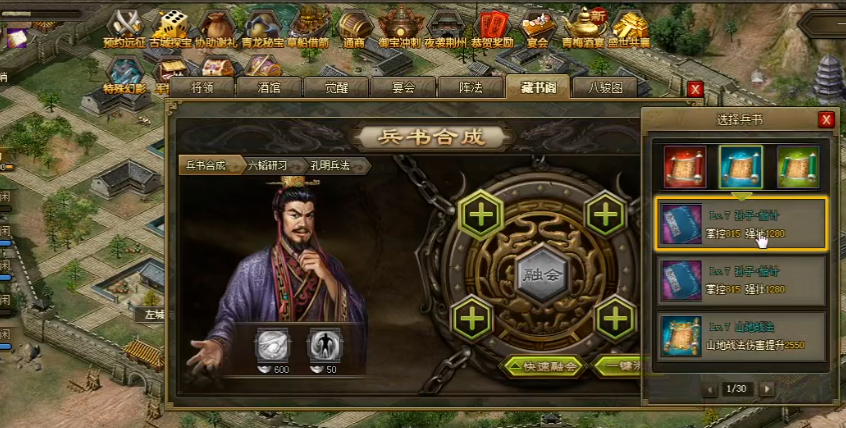 在游戏里面想要合成六韬兵书,首先找到那个叫藏书阁的地方,进去以后就能看到六韬研习的选项了。你得先有对应的六韬碎片才行,没有碎片的话是合不成的。选好碎片系统会提示你放入一些普通的兵书作为材料,这些普通兵书的等级必须符合要求,放错了或者等级不够