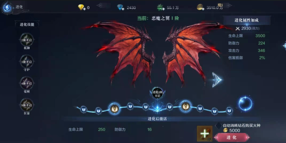 飞行功能是游戏的核心玩法之一,玩家需要通过装备翅膀实现海陆空三栖探索。翅膀系统在角色达到1转时自动解锁,初始获得恶魔之翼,后续可通过升级进化为更高阶的翅膀形态,如绝望之翼、破灭之翼等。飞行操作需在角色界面召唤翅膀,通过上升、下降和加速三个基