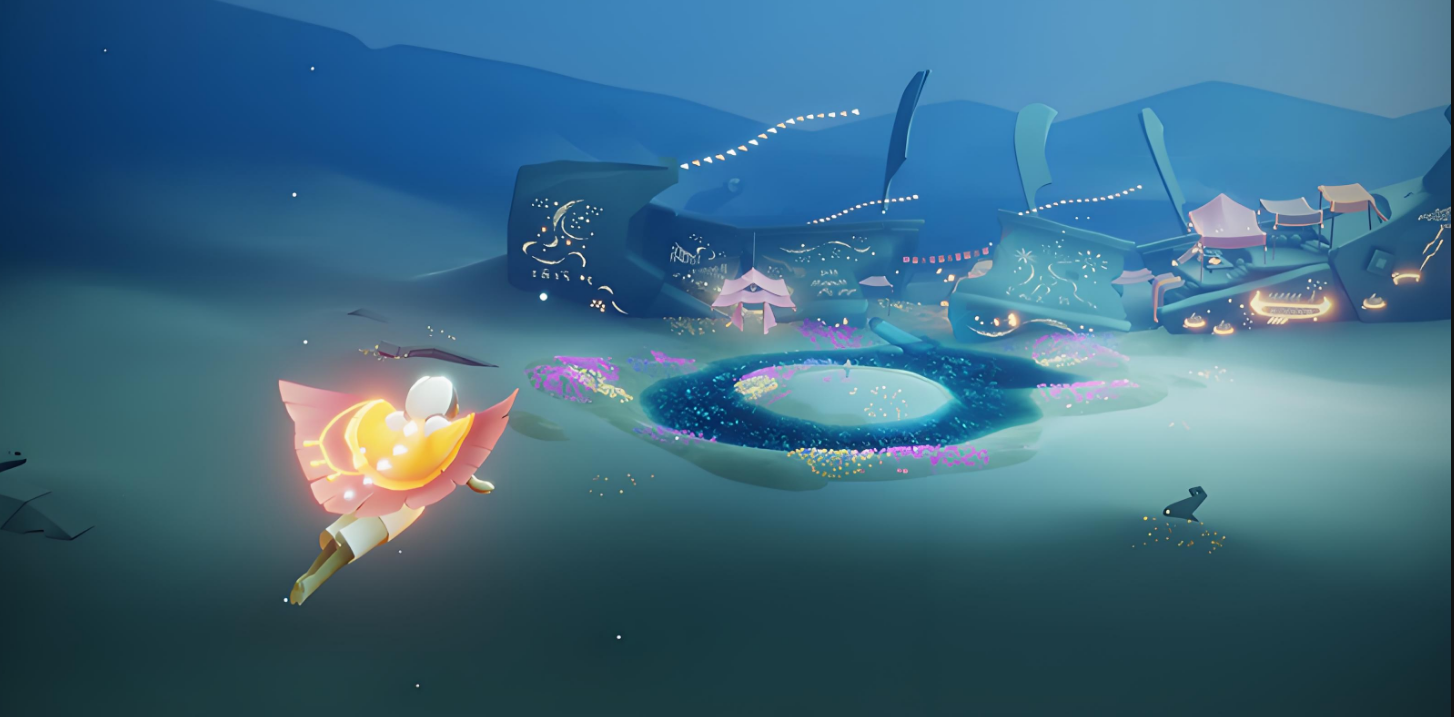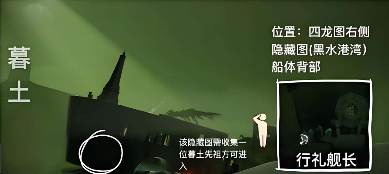 沉船区域的先祖位置是玩家探索的重点之一。要找到沉船先祖,首先需要进入墓土地图的第三张地图四龙图,在入口处往右侧飞行可以发现一个带有光幕的管道口,这是通往沉船图的主要入口。进入后沿着管道前进即可抵达沉船区域,这里分布着多个先祖和光翼。敬礼先祖