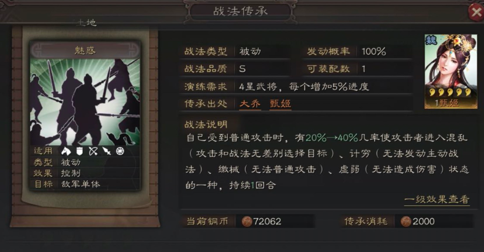 战法的使用分为获取、传承、演练和搭配四个核心环节。首先进入战法界面,点击右下角的战法传承按钮选择需要拆解的武将,确认后消耗该武将即可完成传承,但需注意传承仅生成30%完成度的战法,需通过消耗武将演武提升至100%才能使用。B级战法需三星武将