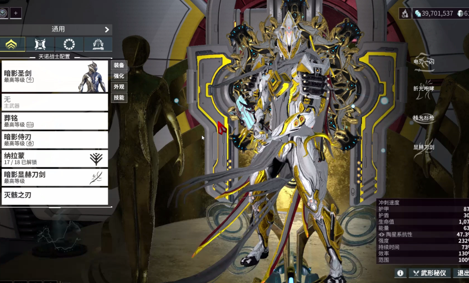 初始提供的三套战甲分别为圣剑(Excalibur)、伏特(Volt)和磁力(Mag)。综合技能机制、操作门槛与泛用性,圣剑是优先级最高的选择。其技能组合涵盖位移冲刺、范围致盲控制及显赫武器召唤,能高效应对开荒期的各类战斗场景。伏特虽具备高爆